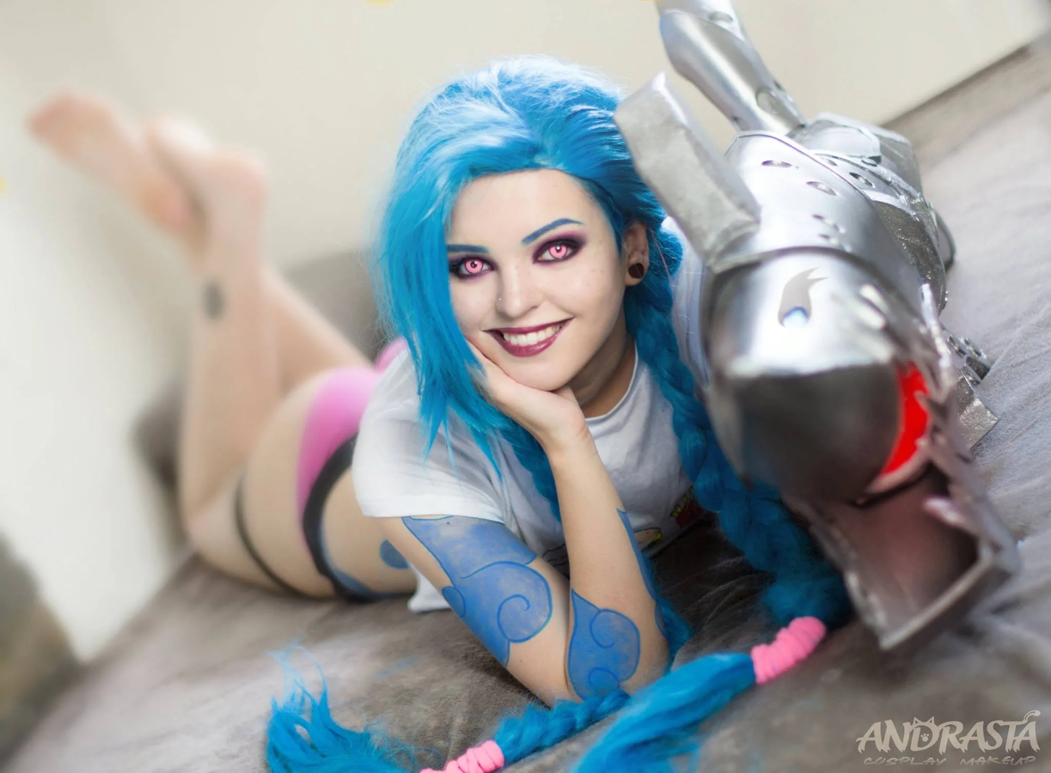 Já que está surgindo variações casuais de personagens de games online (como o Overwatch e o League of Legends, com as skins de “trajes de piscina”) hoje temos uma variação da Jinx, uma das personagens mais loucas de League of Legends. Novamente a cosplayer Andrasta faz uma personagem do jogo (depois da Katarina e da Lux Guardiã Estelar), trazendo uma maquiagem muito bem feita e a personagem com aquela fisionomia lunática, bem característica da personagem.