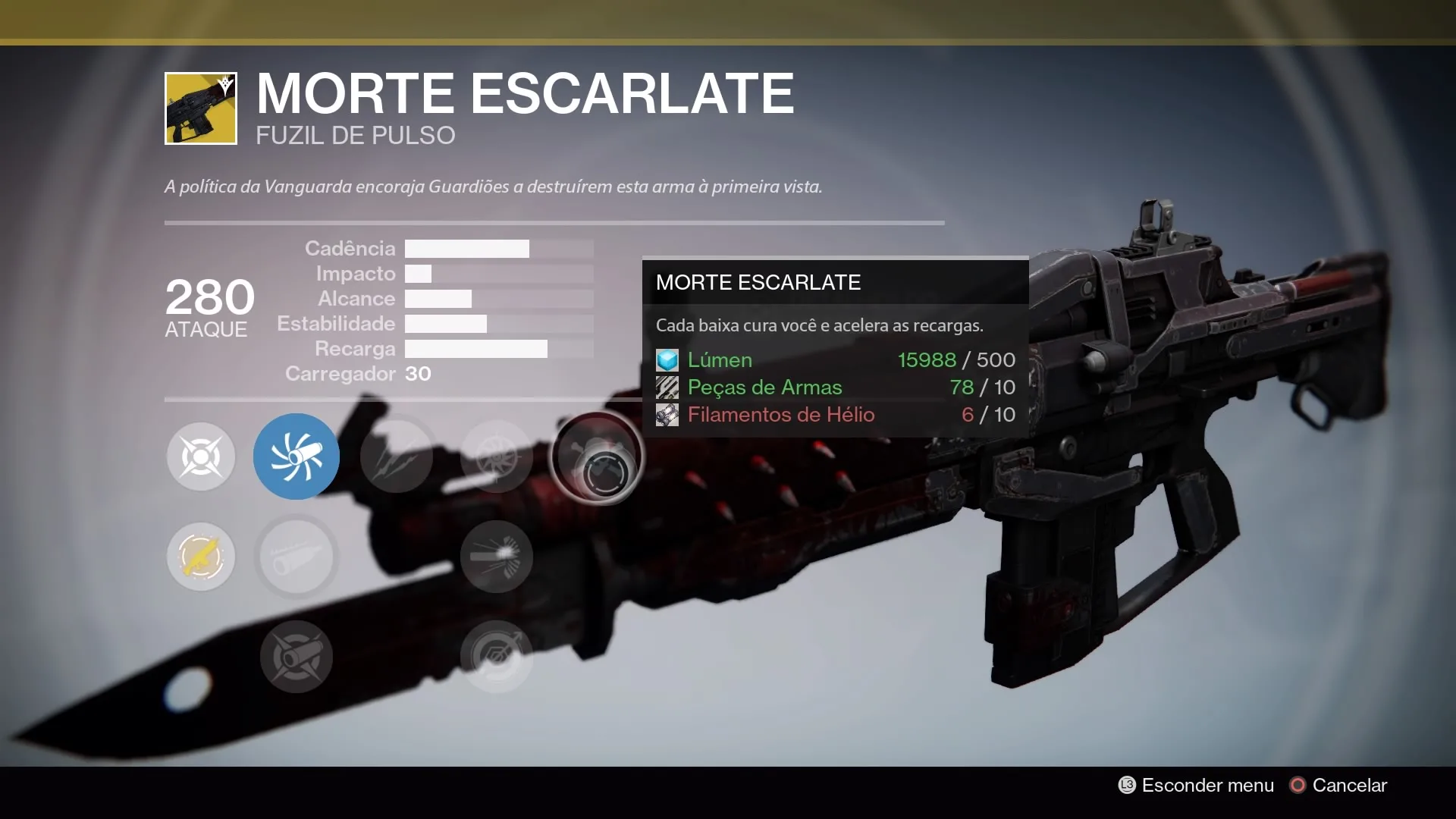 Sexta-feira, Xursday, dia da aparição semanal de novo vendedor misterioso! Apenas hoje e amanhã ele estará no Hangar da Torre, vendendo equipamentos exóticos por moedas estranhas. A cada semana o vendedor traz uma seleção diferente de equipamentos, com algumas ocasiões onde ele vende equipamentos já ofertados anteriormente. Se você ainda não tem a Morte Escarlate, a hora é agora! O fuzil automático está sendo vendido esta semana e é altamente recomendado por conta de seus perks: é mais fácil mirar sob ataque com esta arma e cada baixa cura você e acelera as recargas. No Crisol ela é uma excelente opção, junto com diversas atividades de PvE!