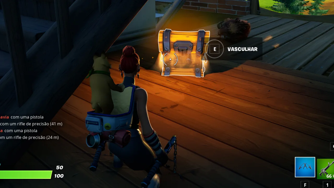 Outro baú que encontrei fica perto de uma escada de madeira. O Fortnite “sinaliza com som” o local onde está o baú.