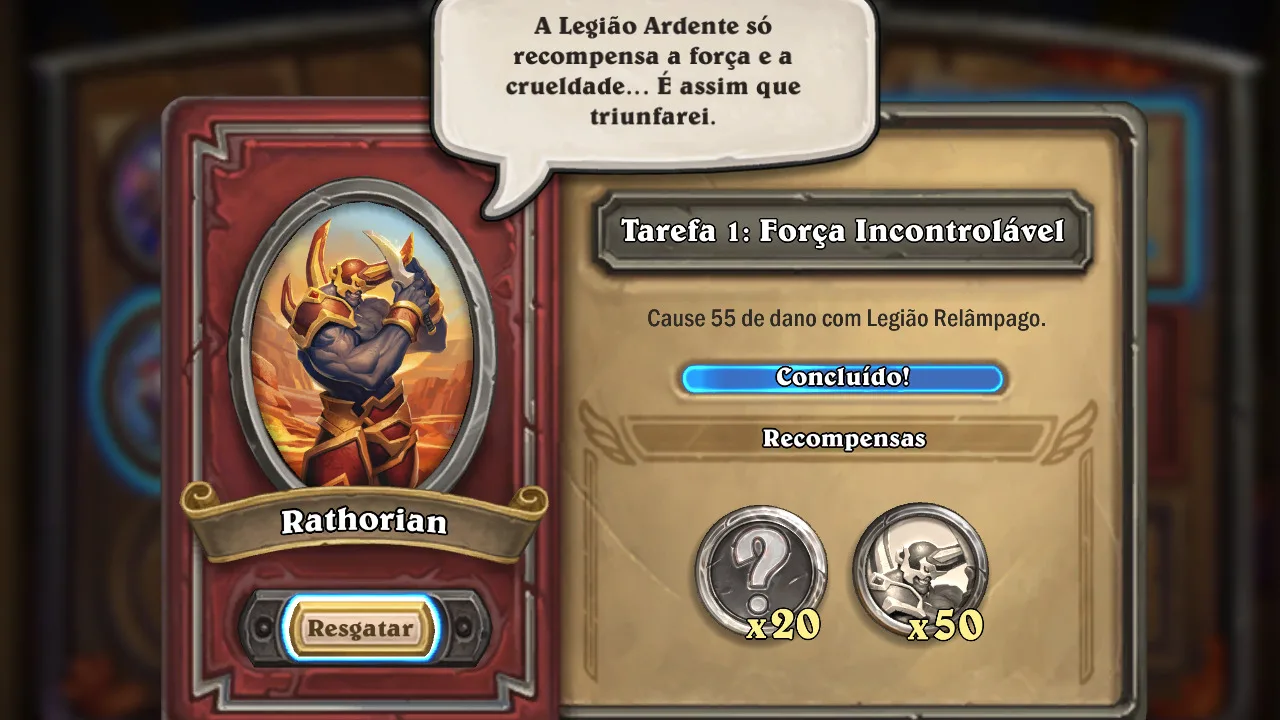 Uma das tarefas diárias que podem aparecer na Fogueira do Modo Mercenários de Hearthstone é uma do Rathorian, com o nome de “Força Incontrolável”. Basicamente causar 55 de dano com a habilidade “Legião Relâmpago“, mas aqui tem 2 maneiras de acelerar o dano, caso o personagem ainda tenha nível inicial.