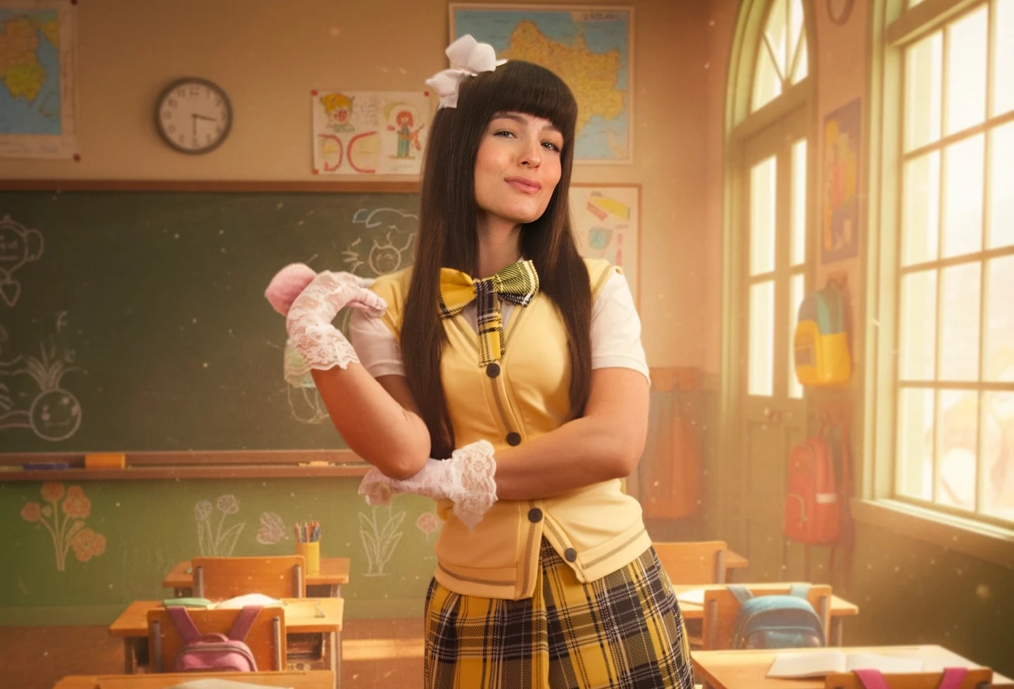 Confira as fotos e o lookinho, do uniforme escolar amarelo, com saia xadrez.