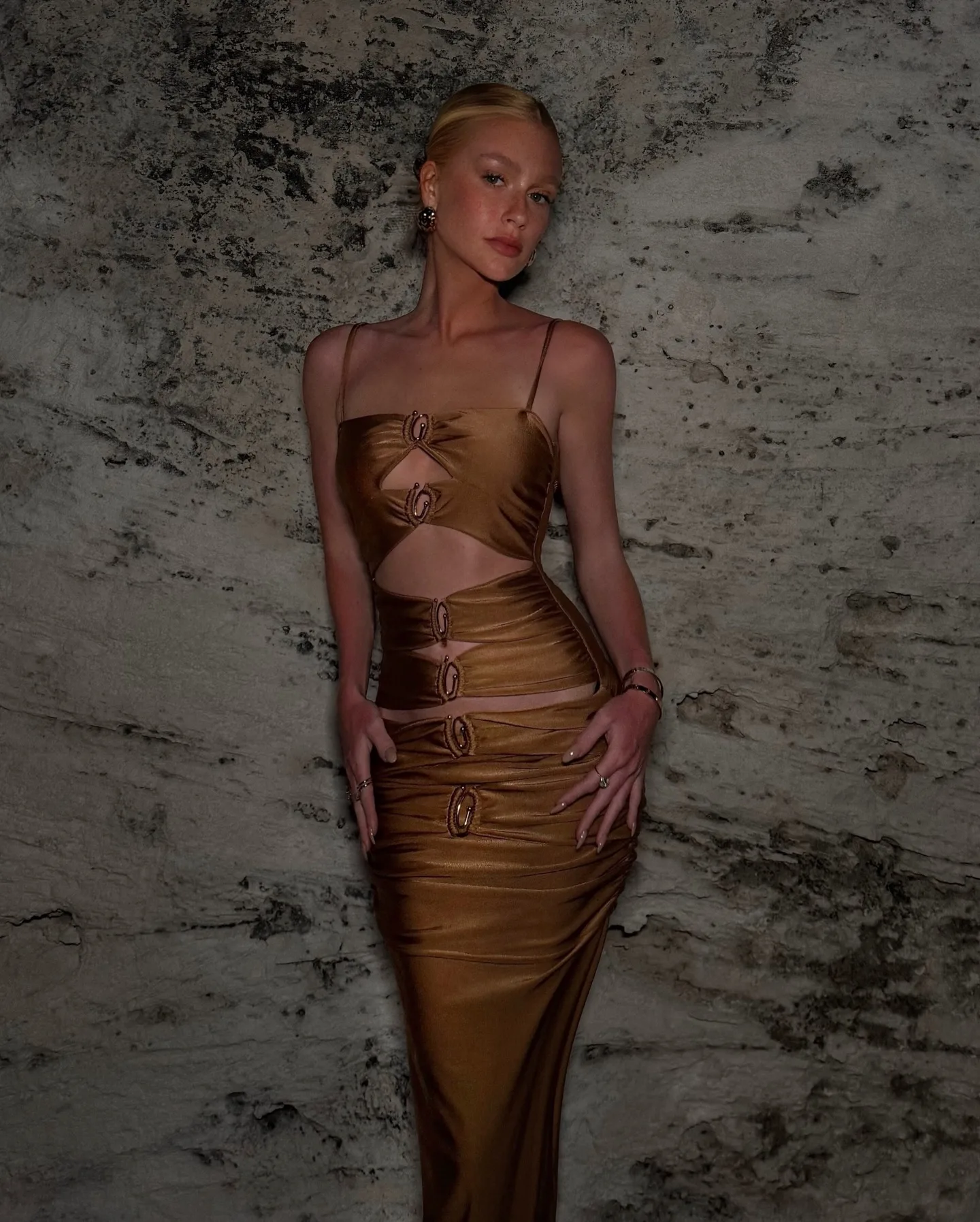 Ela usou vários vestidos na cor marrom.
